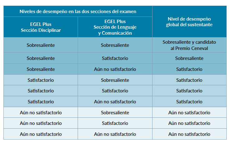 De acuerdo con el Ceneval: “Los sustentantes de esta categoría poseen un conjunto de conocimientos y habilidades indispensables asociados a niveles cognitivos superiores a los alcanzados en el nivel satisfactorio, que son capaces de demostrar en contextos y condiciones de una mayor complejidad. El 25% de lo que se evalúa en cada una de las áreas de la prueba está dirigido a los estudiantes con conocimientos y habilidades sobresalientes”.
