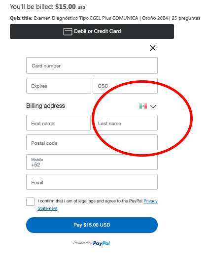 PASO 3. Si decides pagar con débito o crédito se te mostrará un pequeño formulario para introducir tus datos y terminar la transacción. Procura seleccionar la bandera de México si realizas tu pago con una tarjeta de débito o crédito mexicana, de otra forma el sistema no te dejará pagar. (Si tienes una tarjeta de Estados Unidos, simplemente selecciona la bandera de ese país) 🇲🇽 🇺🇸