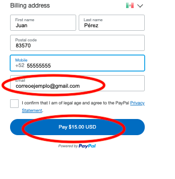PASO 4. Ingresa tus datos bancarios correctamente. Para tu tranquilidad y seguridad puedes estar seguro que nosotros no tenemos ningún acceso a eso a estos datos. Por tu privacidad, todos los datos son procesados por PayPal, ya sea que pagues con su servicio o alguna tarjeta bancaria. La cantidad final a pagar aparecerá en pesos mexicanos (es posible que PayPal te cobre una pequeña comisión por usar su servicio con moneda mexicana).